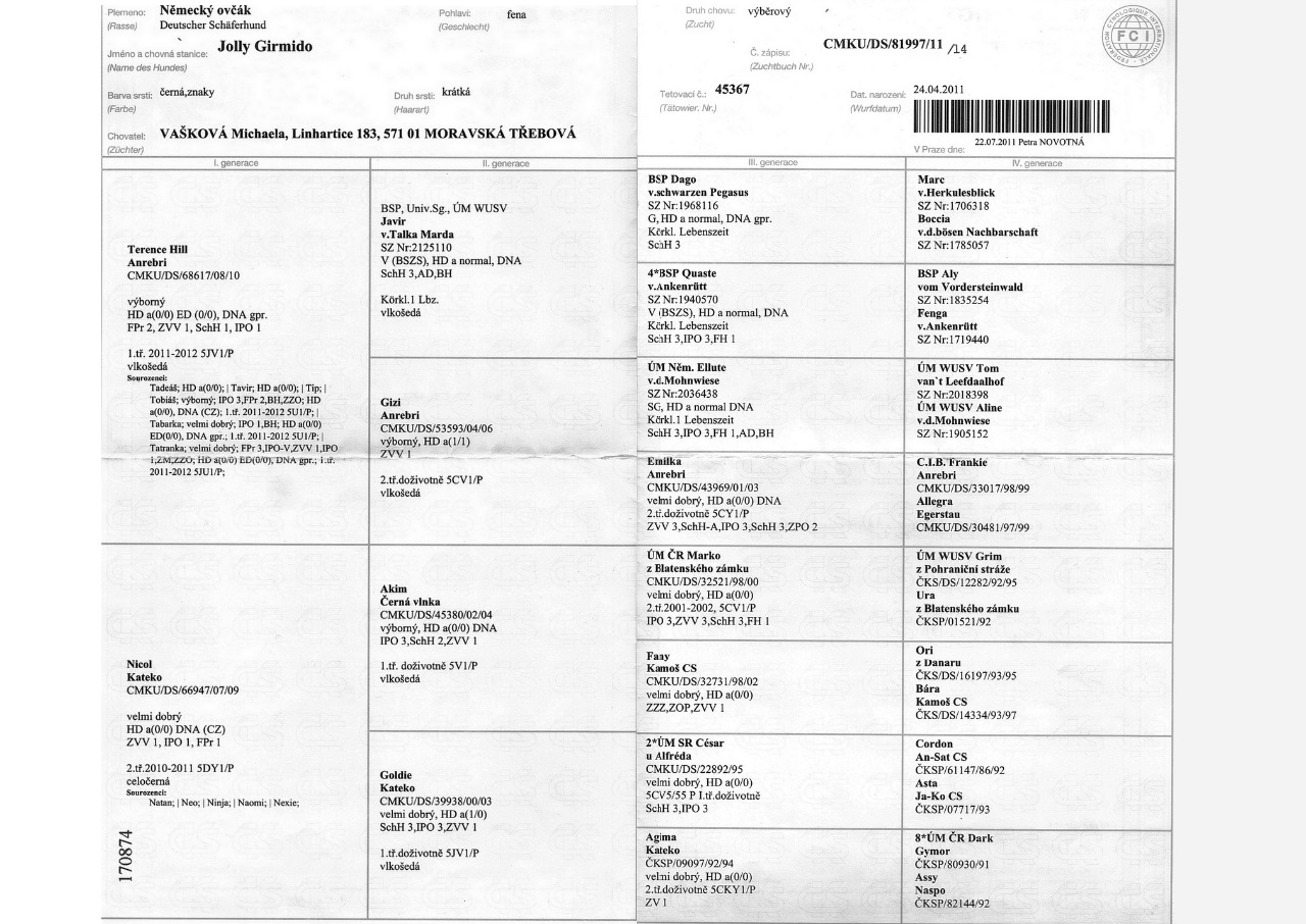 Matka: Nicol Kateko, rtg DKK 0/0, ZVV 1, FPr 1, IPO 1 Otec: Terence Hill Anrebri, rtg 0/0, ZVV1, IPO2, FPr2, IPO3